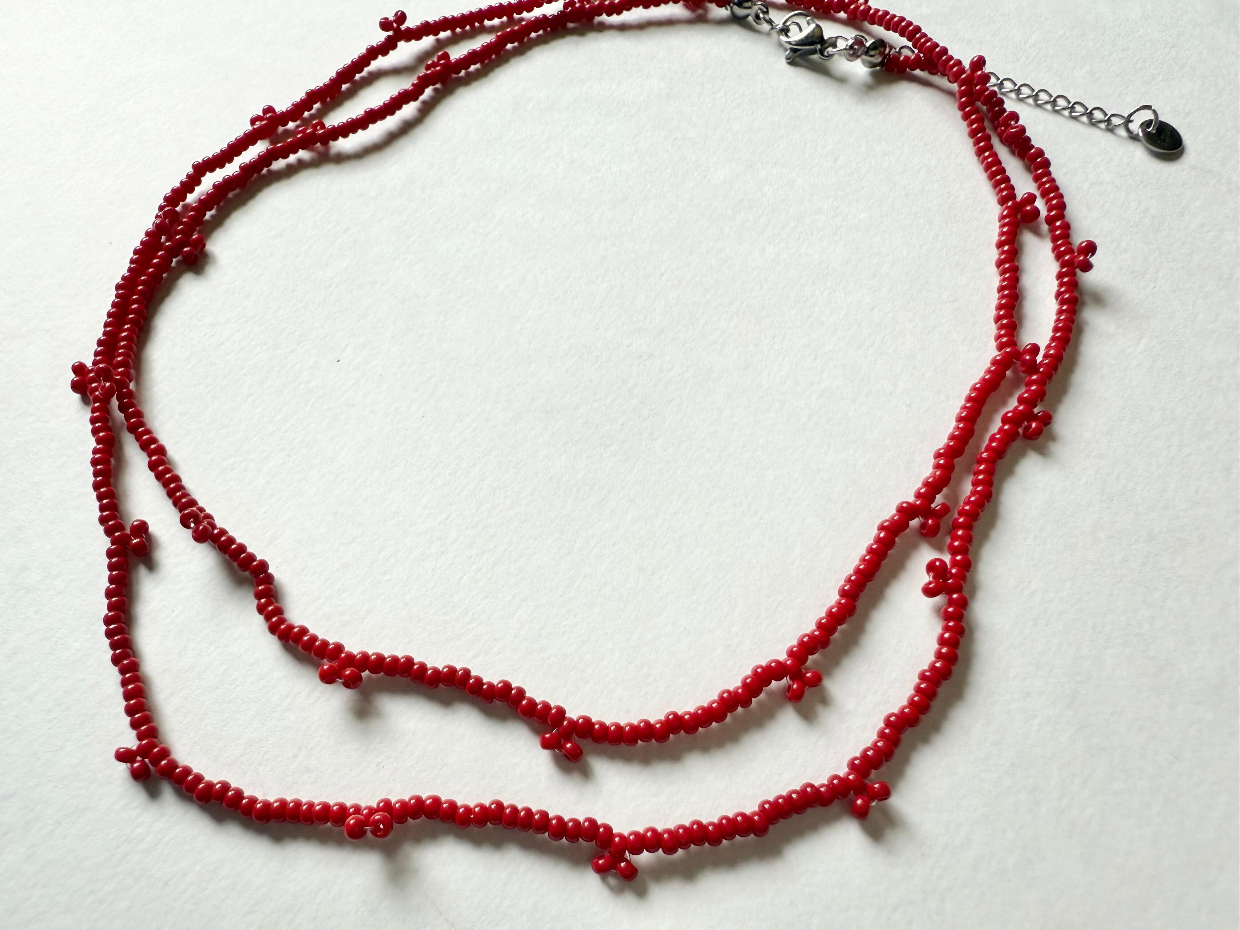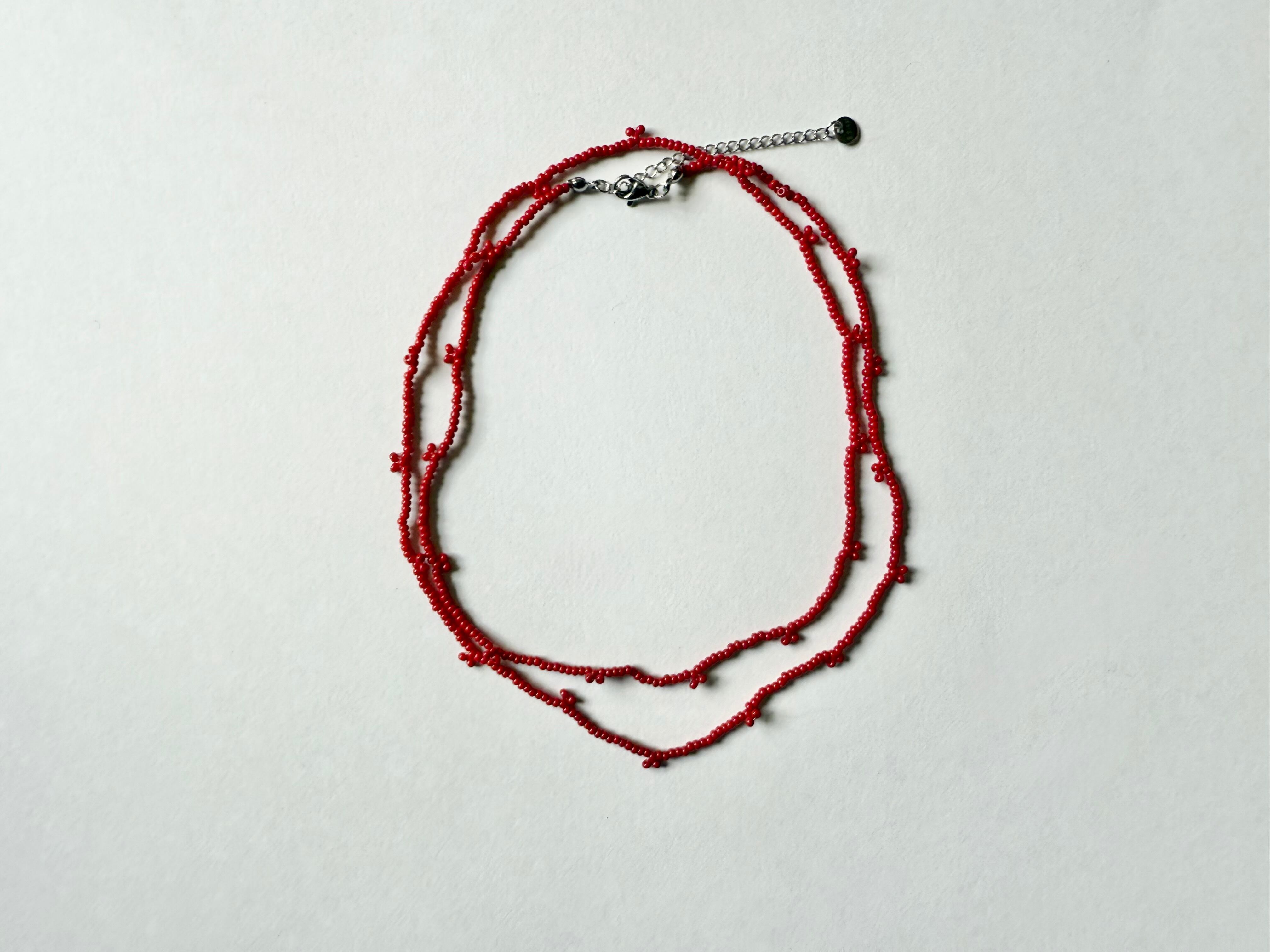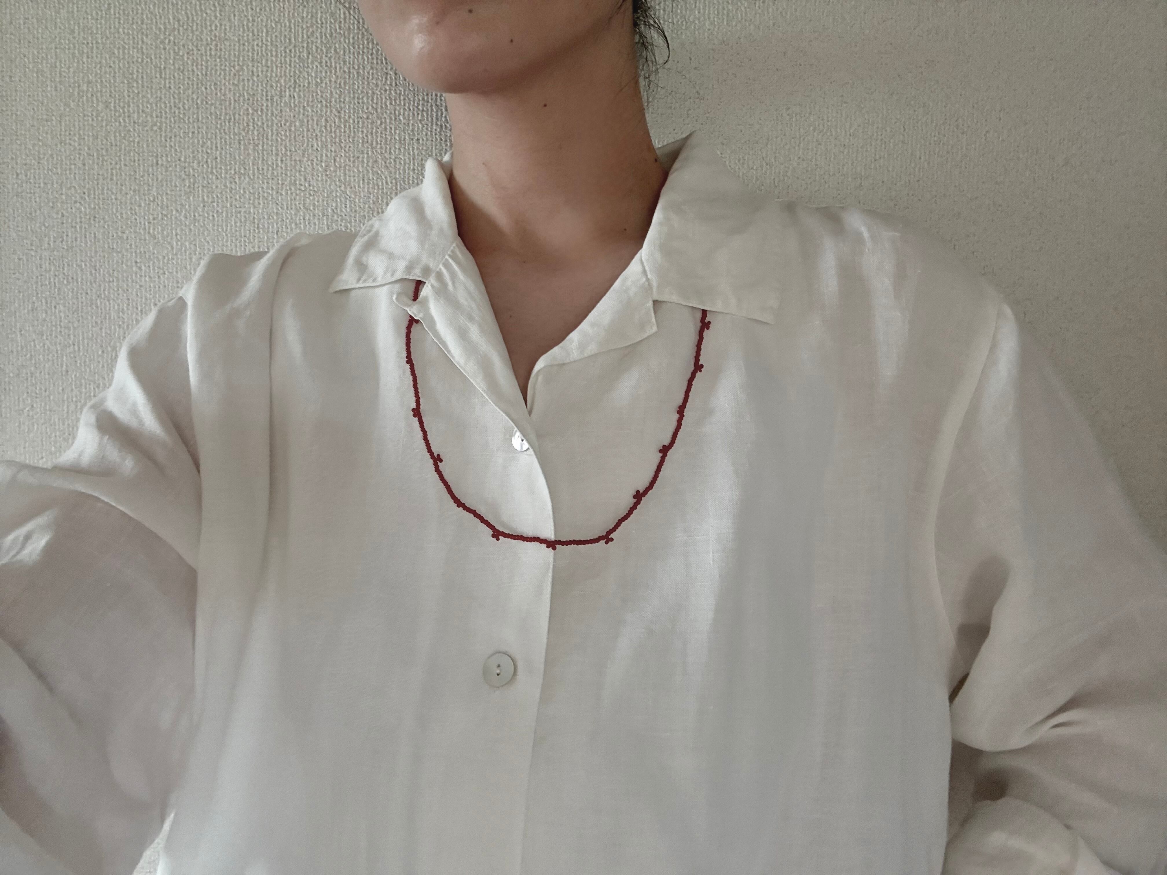 使い勝手の良い単色のビーズネックレス。小さなレースのようにしたくてさんかくを等間隔に配置しました。ロングのままでも、二重にしてチョーカーとしてもお使いいただけます。