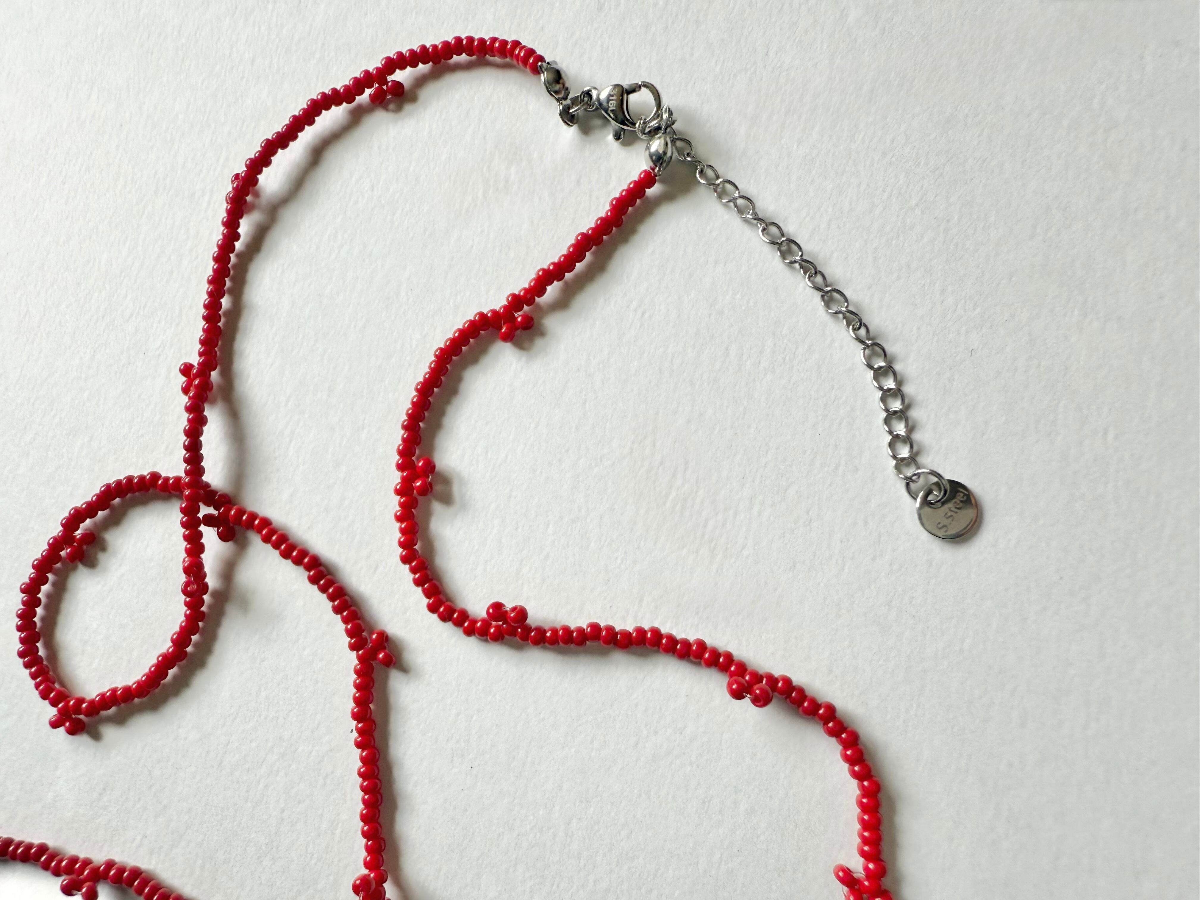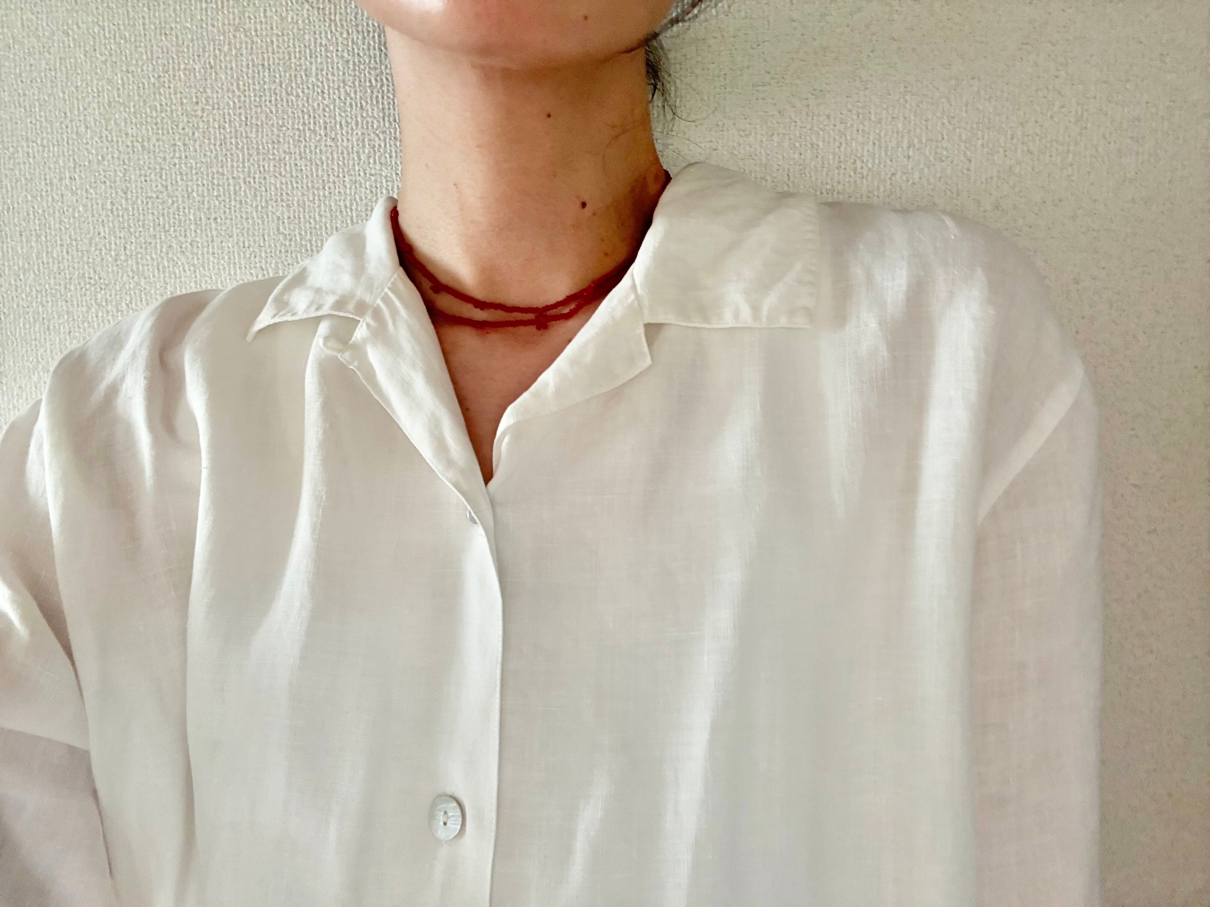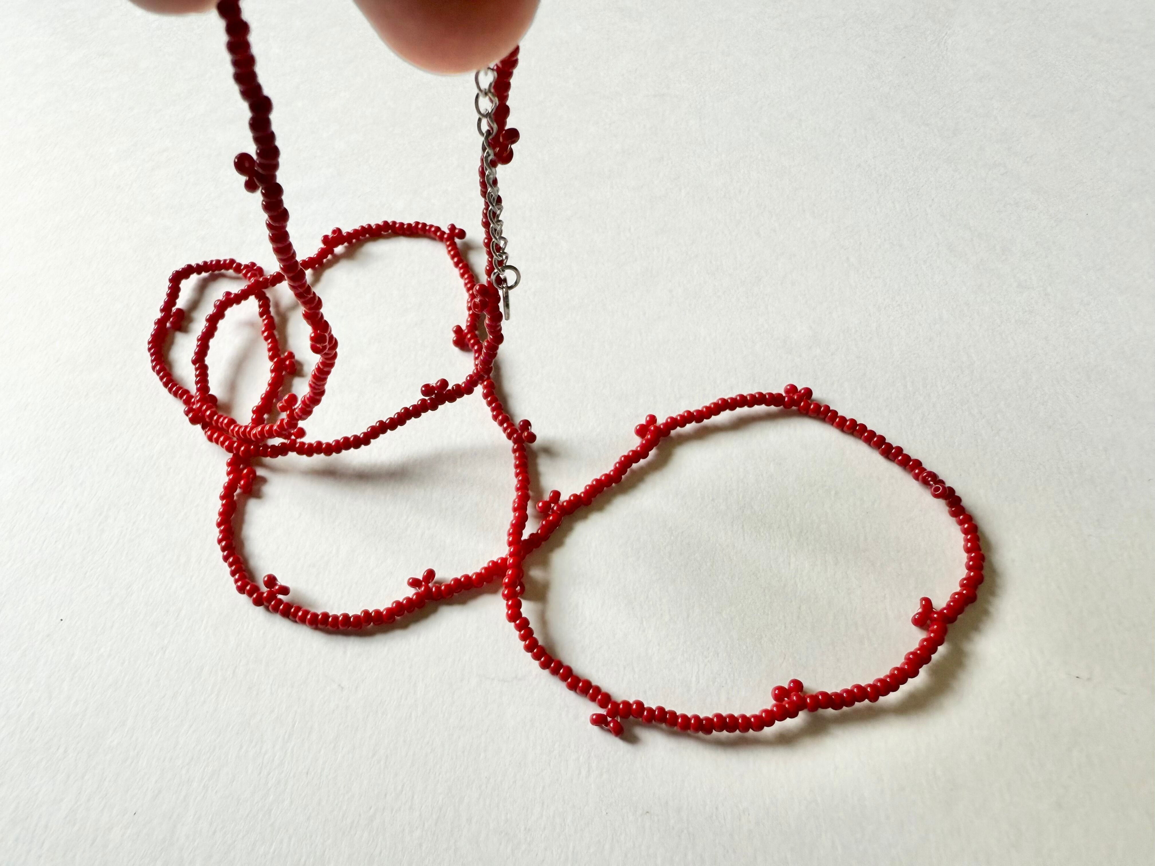 使い勝手の良い単色のビーズネックレス。小さなレースのようにしたくてさんかくを等間隔に配置しました。ロングのままでも、二重にしてチョーカーとしてもお使いいただけます。