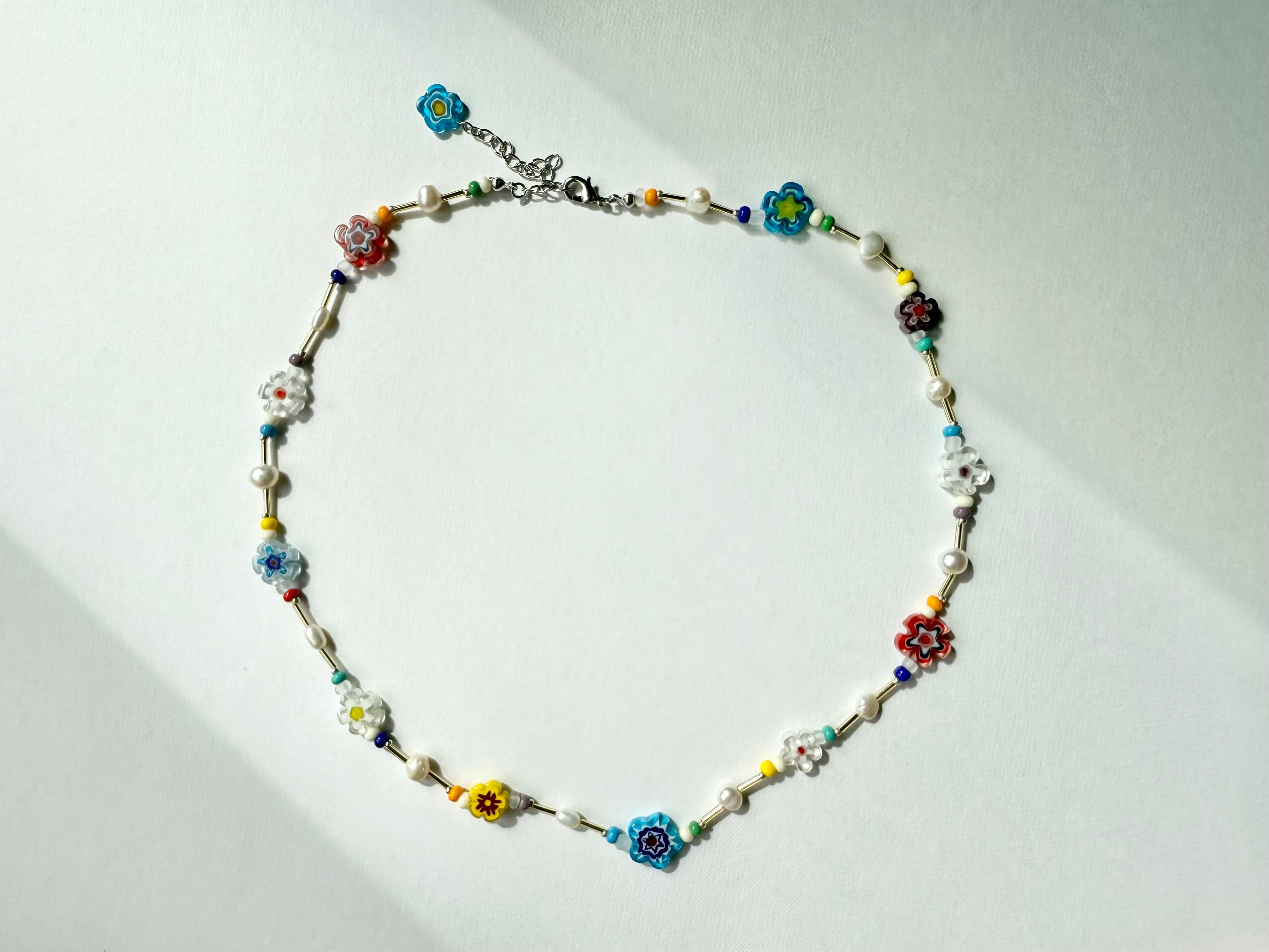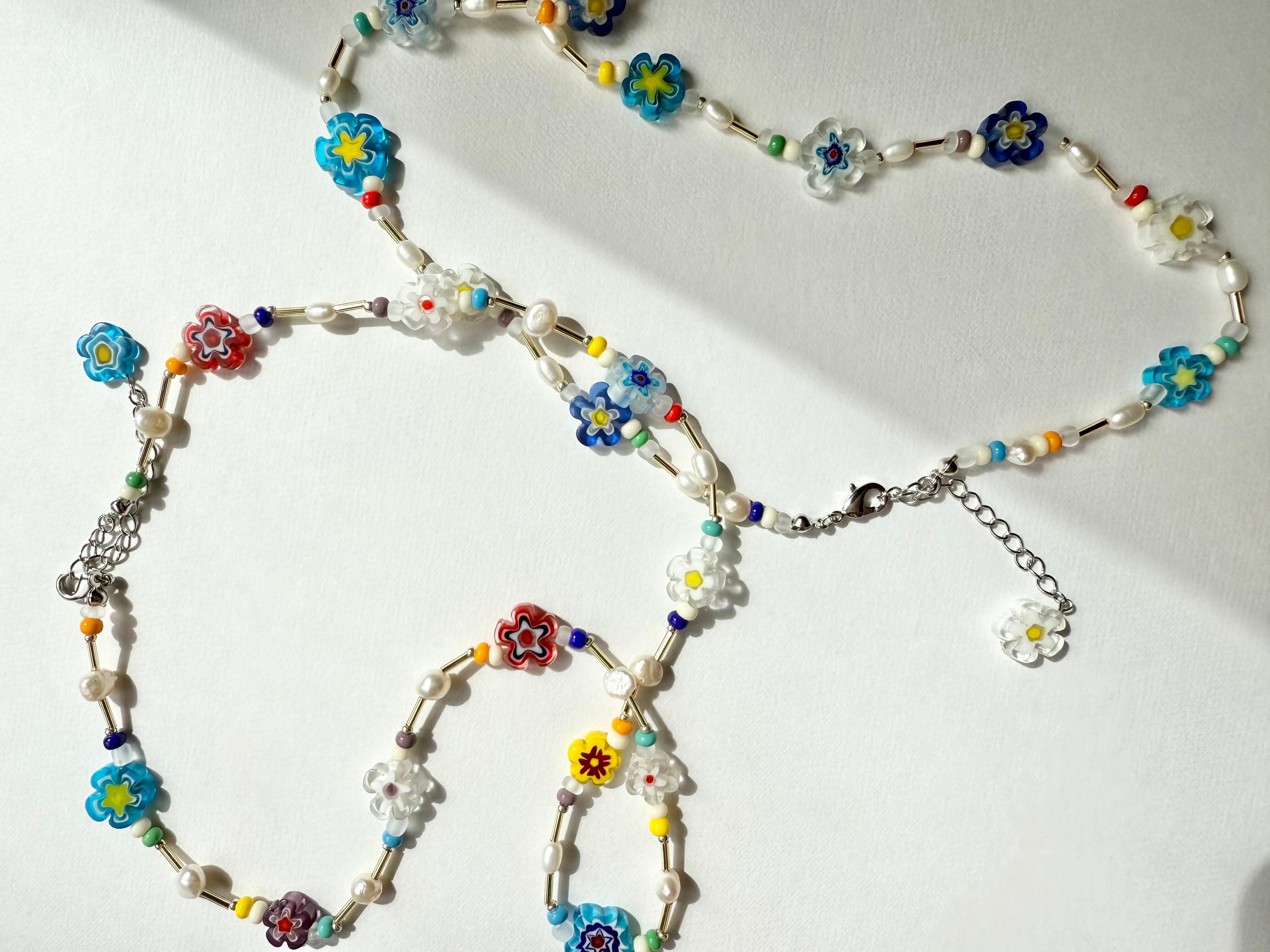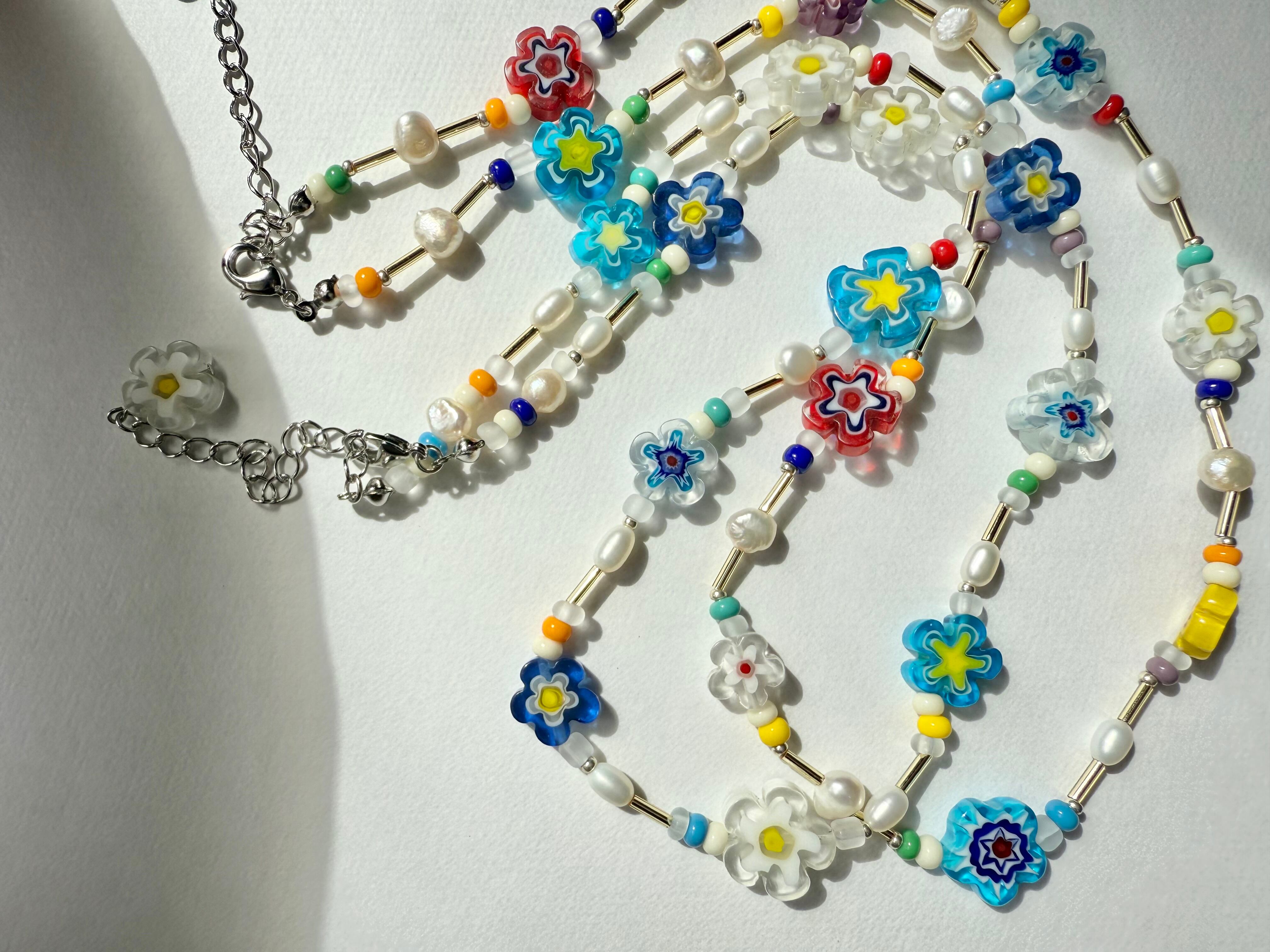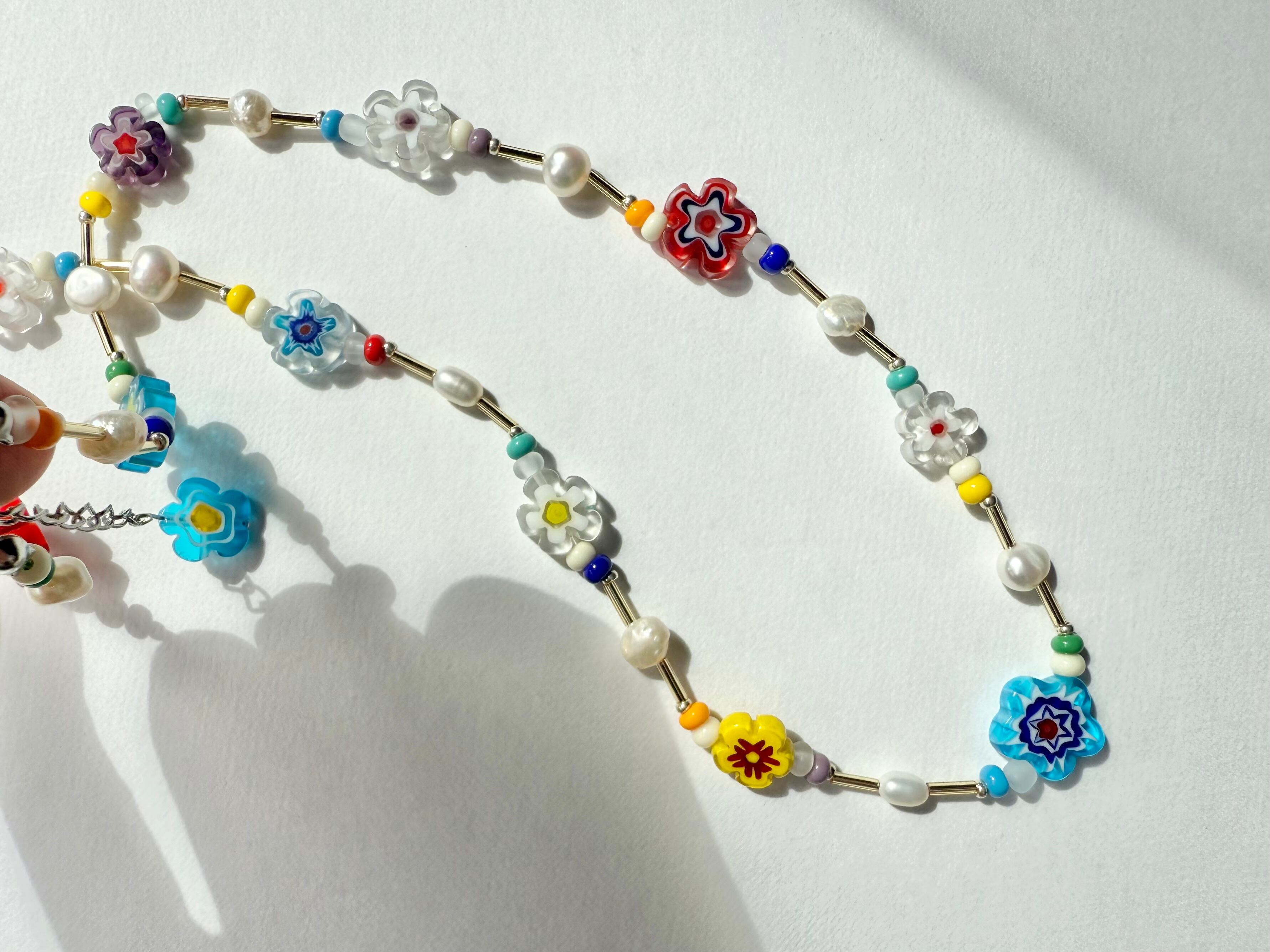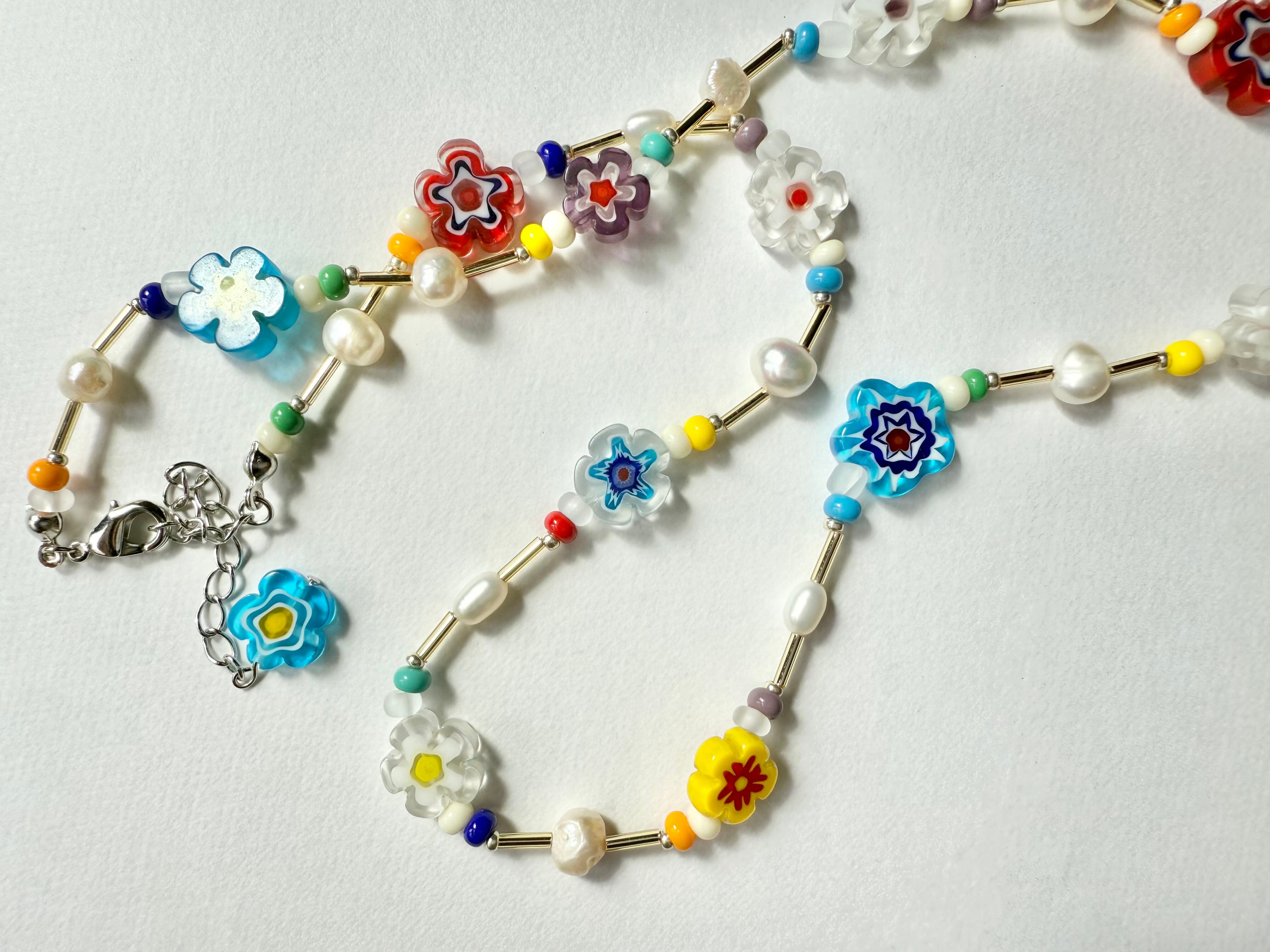 大きめフラワーのミルフィオリと淡水パールを竹ビーズと大きめのシードビーズで引き立たせたネックレスです。リクエストで作りましたが可愛くできたので販売いたします☺︎
