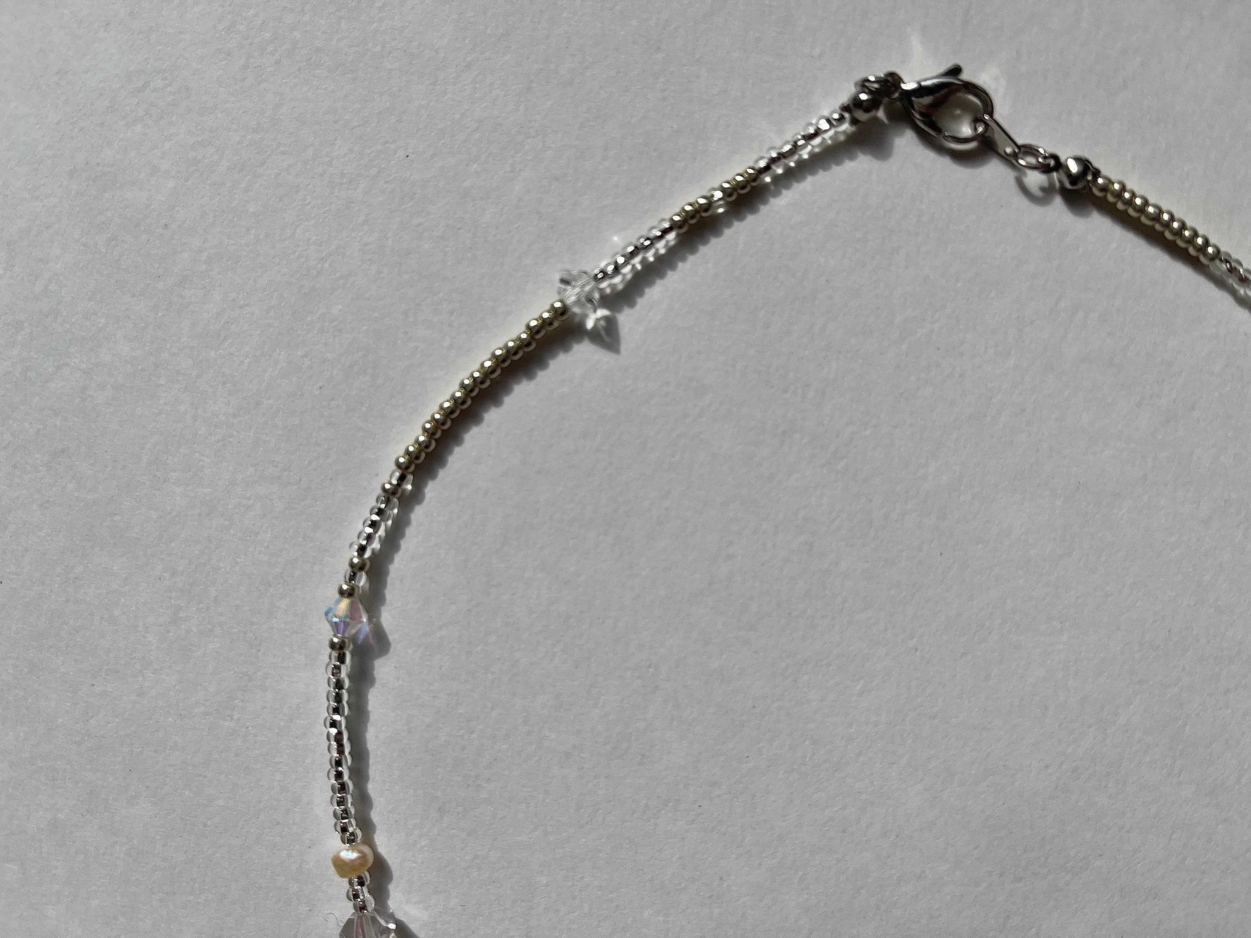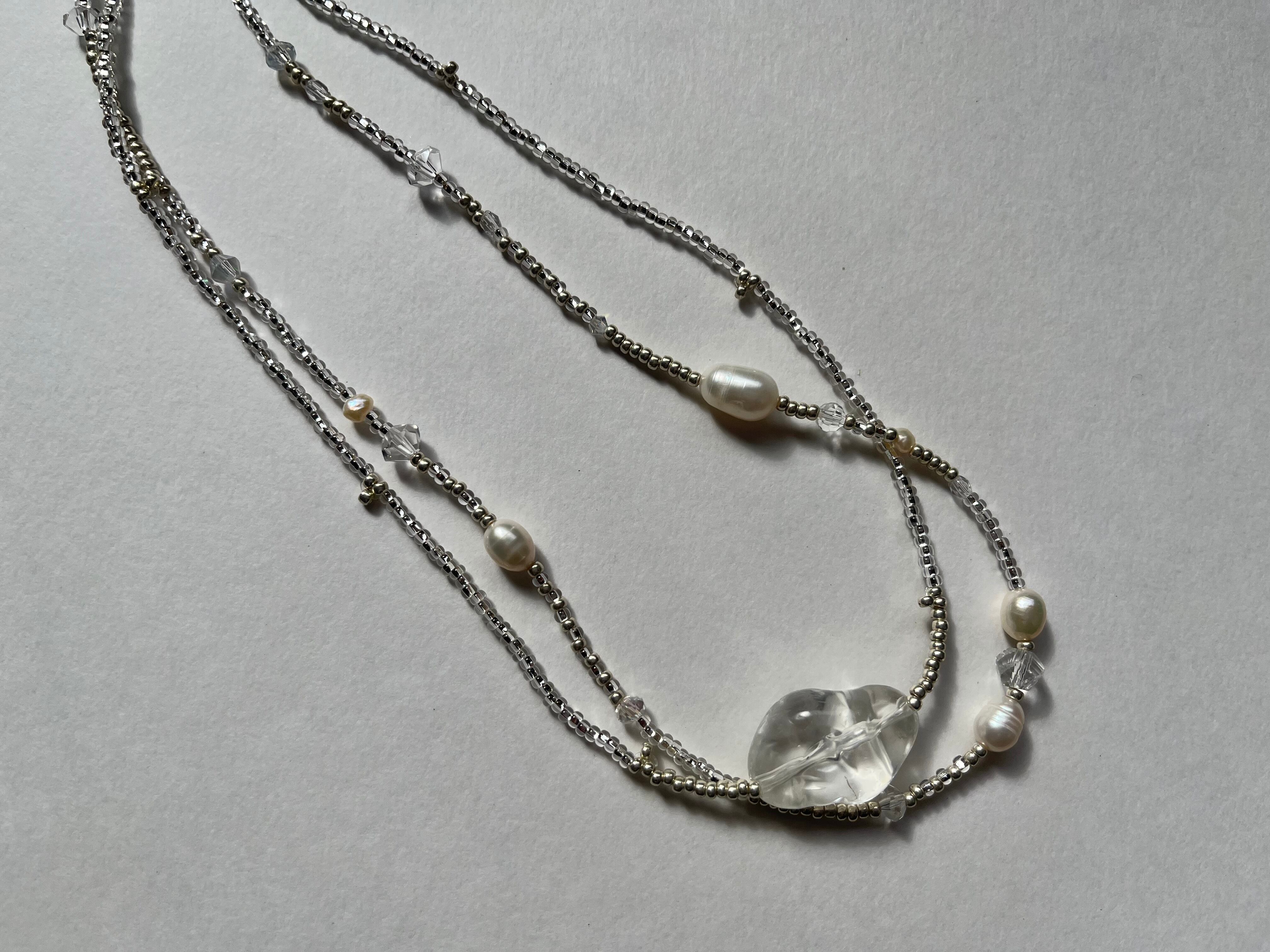 シルバー、クリアのビーズと、パール、多面カットのクリアやオーロラのビーズ。