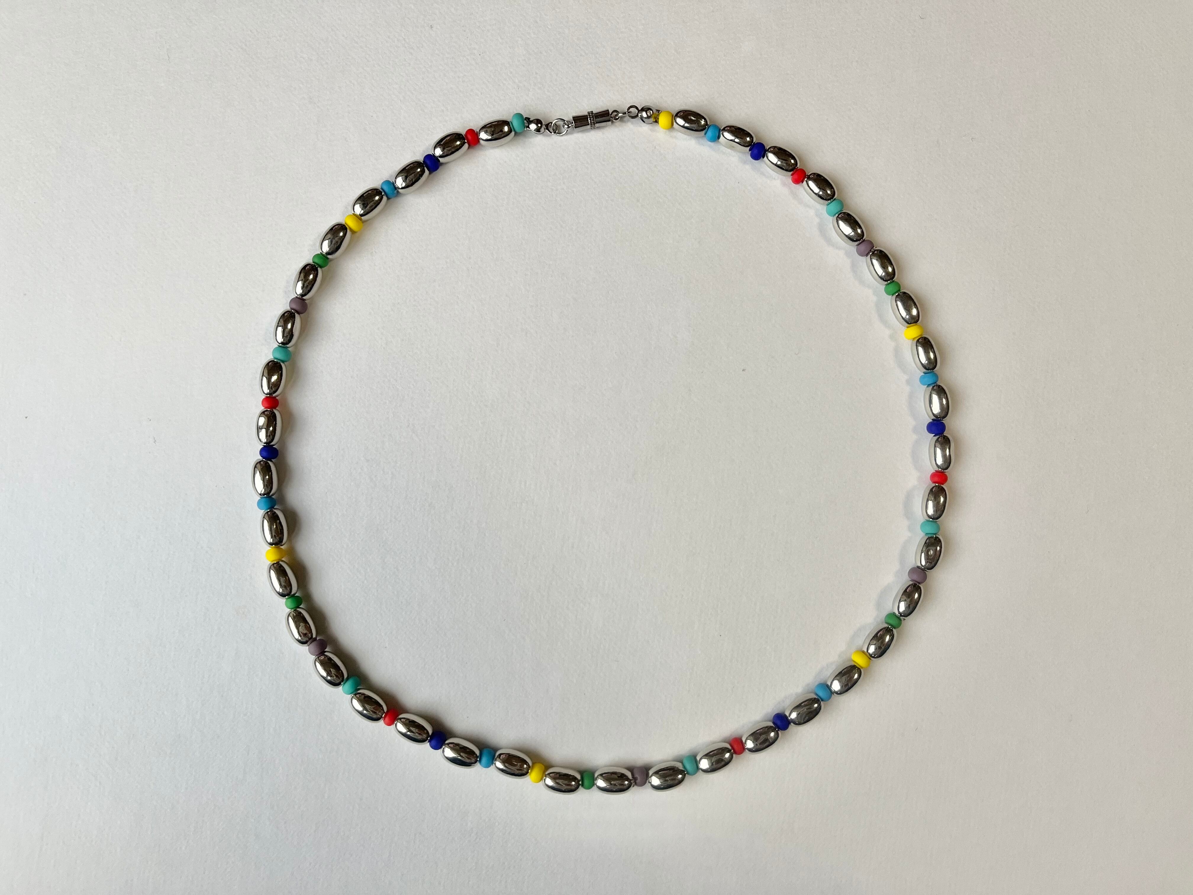 シルバーのアクリルCCBビーズとカラフルでマットなチェコビーズのハッピーなネックレス。