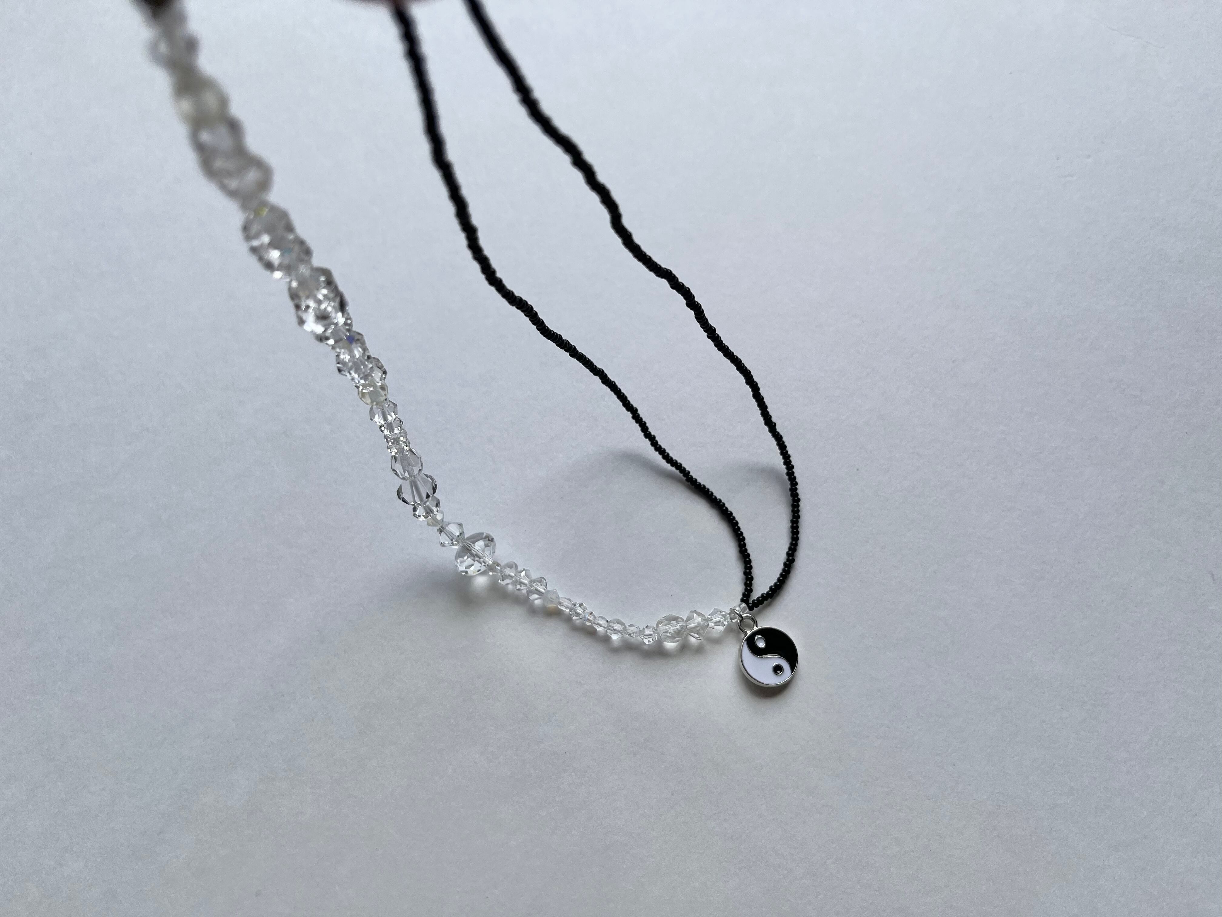 チャームに合わせて黒いボヘミアンビーズとさまざまなサイズとカットのクリアビーズ。