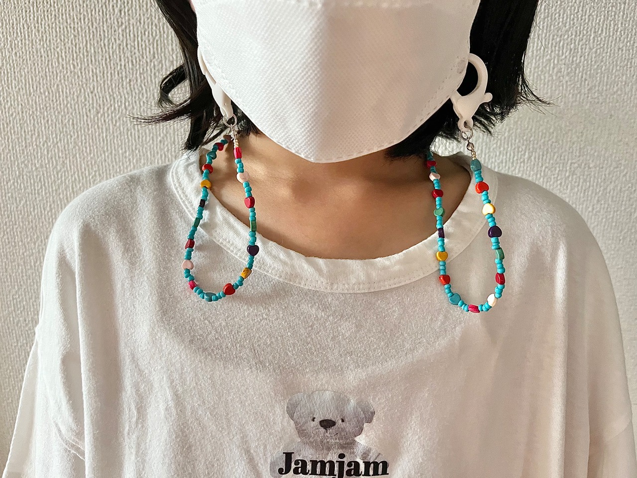 ハート形のカラフルなウッドビーズにターコイズカラー。意外といろんなコーディネートに合いそう♡